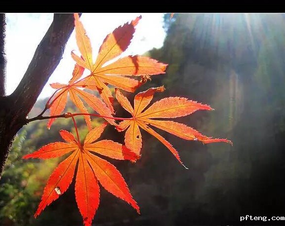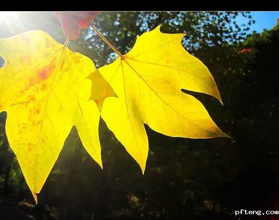 3、捡起两片飘落的叶、透着阳光,可以看见叶子的清晰脉纹,秋叶的飘落不是一种结束,而是一种生命的开始。秋叶归根,是生命的开始,因为她在地底下孕育着新的生命。历经严冬,等到到来年春天跃上枝头 ,带给人们以春的欣喜~