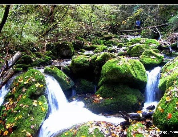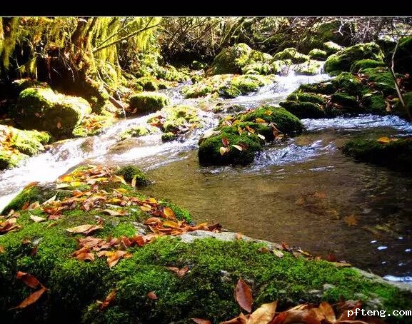 6、山谷的溪流旁又是一番景象。站在小溪旁、片片枫叶在飞舞,慢慢地旋转着从树上落下,落在清澈的溪流中、落在岸边碧绿的苔藓上,此情此景、我只想坐在岸边看树叶飘零、听溪水潺潺,静静地不愿离去~