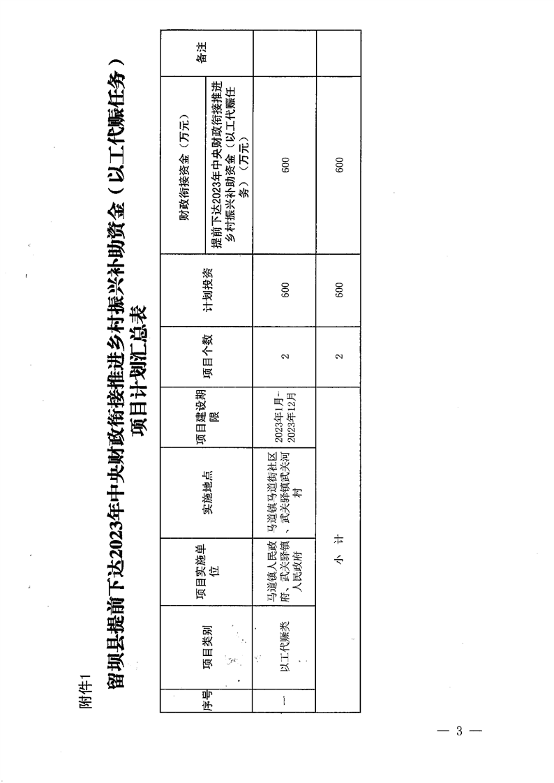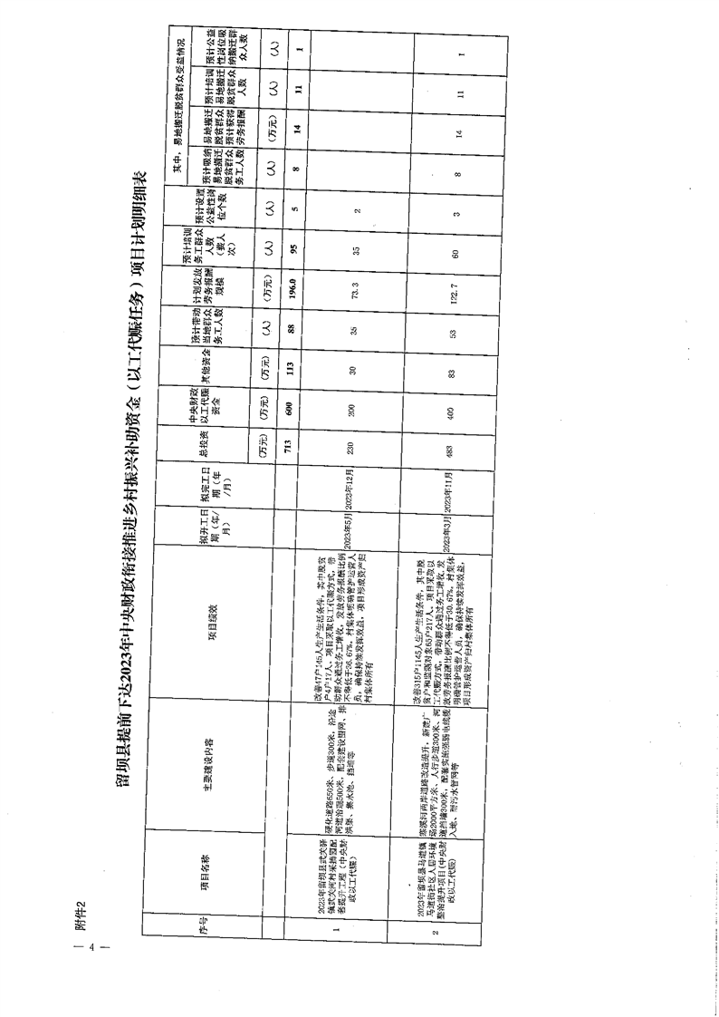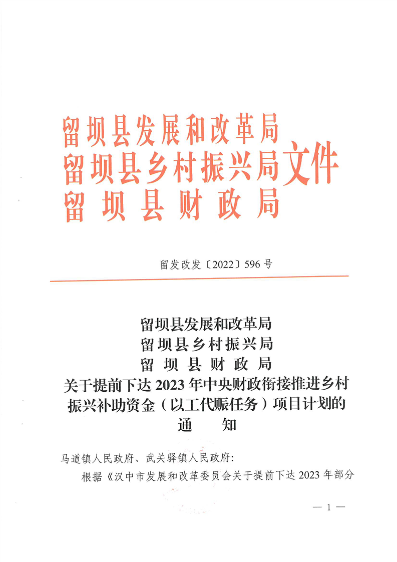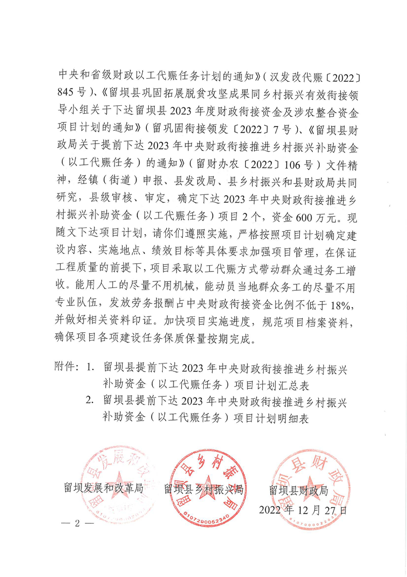 留坝县提前下达2023年中央财政衔接推进乡村振兴补助资金(以工代赈任务)计划的通知