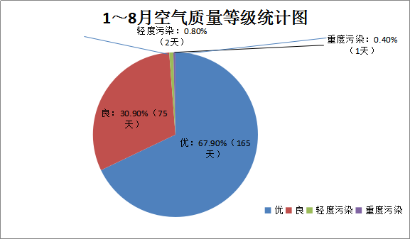 1~8月,优165天、良75天、轻度污染2天、重度污染1天,优良率98.8%,优良天数同比增加1天,排名全市第二。