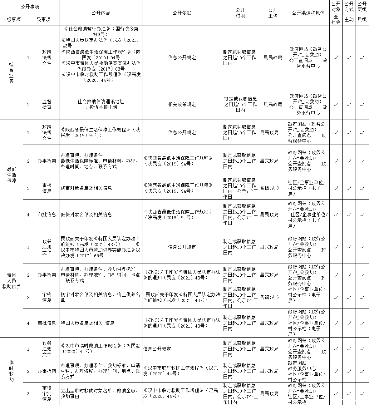 留坝县社会救助领域基层政务公开标准目录