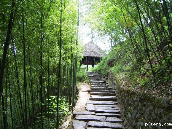 张良庙草亭,由回云亭或者五云楼拾级而上,在山径曲迴之处,万竿烟雨中耸立一亭,顶盖如笠,茅草盖就,丹柱碧栏,乖巧清新。名曰茅亭,亦叫草亭。