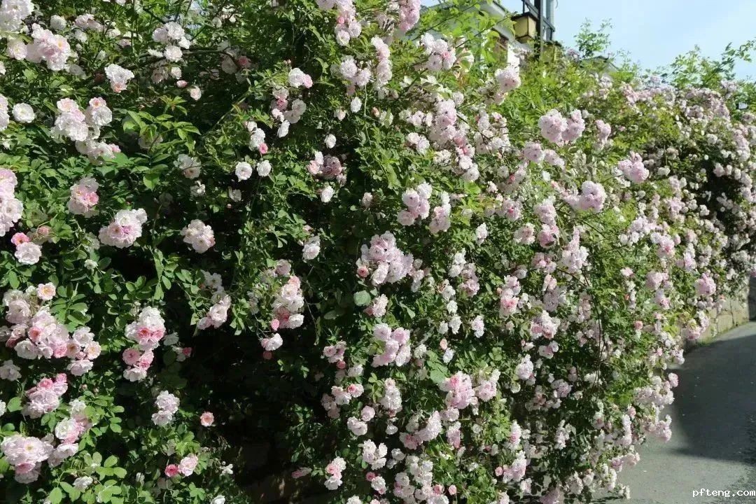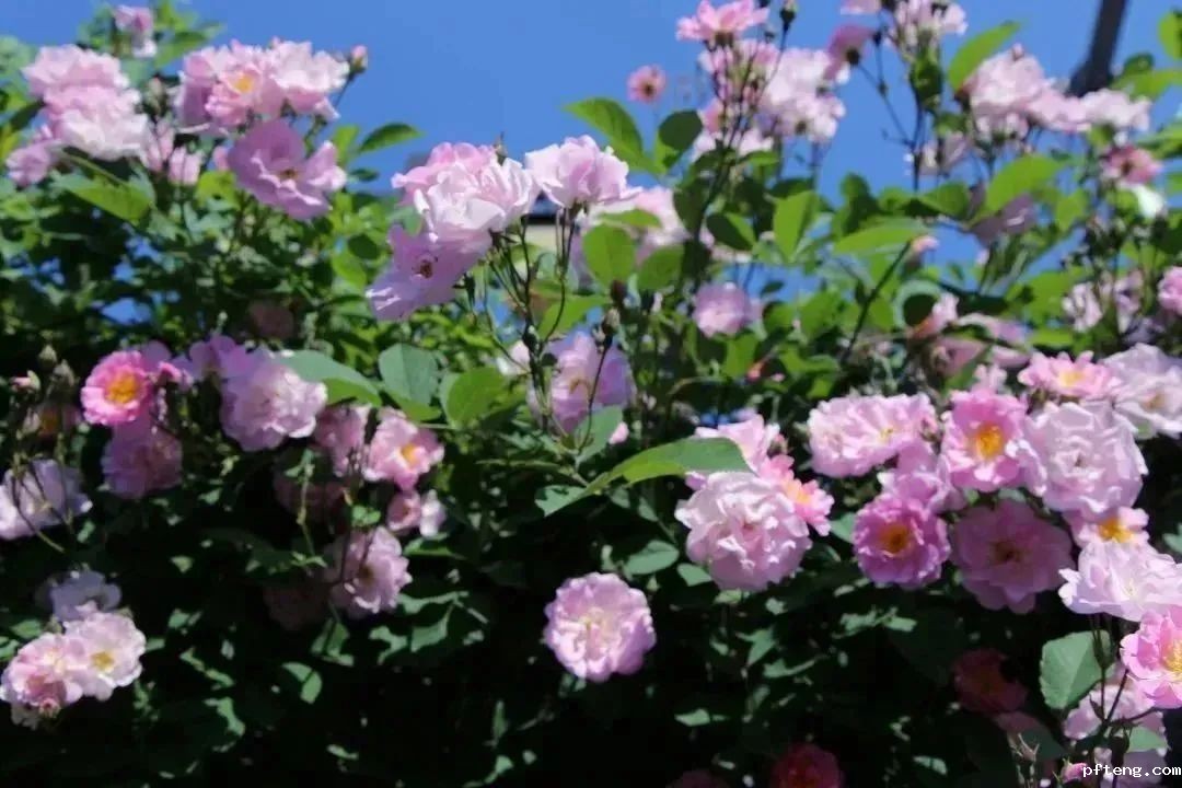 厅城路上高高的城墙,随处可见一簇簇蔷薇花爬满墙头,悄然静静地绽放她的美丽。她们或粉或红,或白或紫,个个是那样的柔弱,却又是那样的坚韧,在阳光的照耀下娇艳绽放,散发着淡淡的清香。