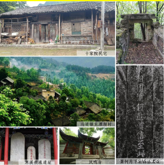 1.望中怀古·寒溪夜涨—龙潭坝村:龙潭坝村位于马道镇寒溪河上源,距马道镇约十公里,是“萧何月下追韩信”的历史故事发生地,“不是寒溪一夜涨,焉得汉室四百年”的寒溪之水源自龙潭坝。该村现存建筑81栋,其中传统民居61栋,民居按组团的方式沿着山谷内的道路和寒溪河呈带状散点式分布,村内75%的建筑多保持着传统样式,分散排列,传统风貌完好。2023年入选第六批中国传统村落、陕西省第六批历史文化名村、陕西省美丽宜居示范村。