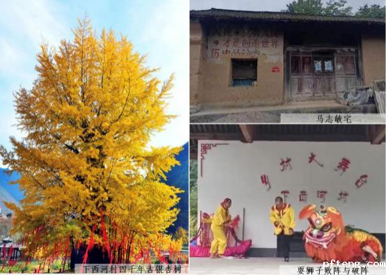 11.千年银杏·民俗文化—下西河村:下西河村位于玉皇庙镇,村内民俗和民艺活动丰富,汉中市级非物质文化遗产狮子坝地社火、下西河耍狮子摆阵破阵、传统民歌远近闻名。村中还有西北第一,全国第三4000多年树龄的国家一级保护古树银杏树,有400多年的青枫树、铁索桥、龙王池、清代遗留龙王庙遗址、太平寺、马志敏宅、马如锦宅等清代建筑,整体建筑与当地环境融为一体,体现了古人建村选址的智慧。2023年入选第六批中国传统村落。