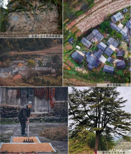14.南北融合·传统建筑—磨坪村:磨坪村位于江口镇。古时磨坪村作为栈道的一处必不可少的枢纽,连接陕南和关中地区,在经过时间的洗礼之后,形成了一种古村落与栈道文化相结合、陕南与关中相结合的具有当地特色建筑风格。磨坪村许家山传统村落主要以黄色旁土做墙体、青色小瓦做屋顶,同时辅之木格窗、人字顶,采取打笆做泥的方式处理屋面,兼具陕南和关中民居建筑特征。2019年入选第五批中国传统村落,2022年入选陕西省美丽宜居示范村。