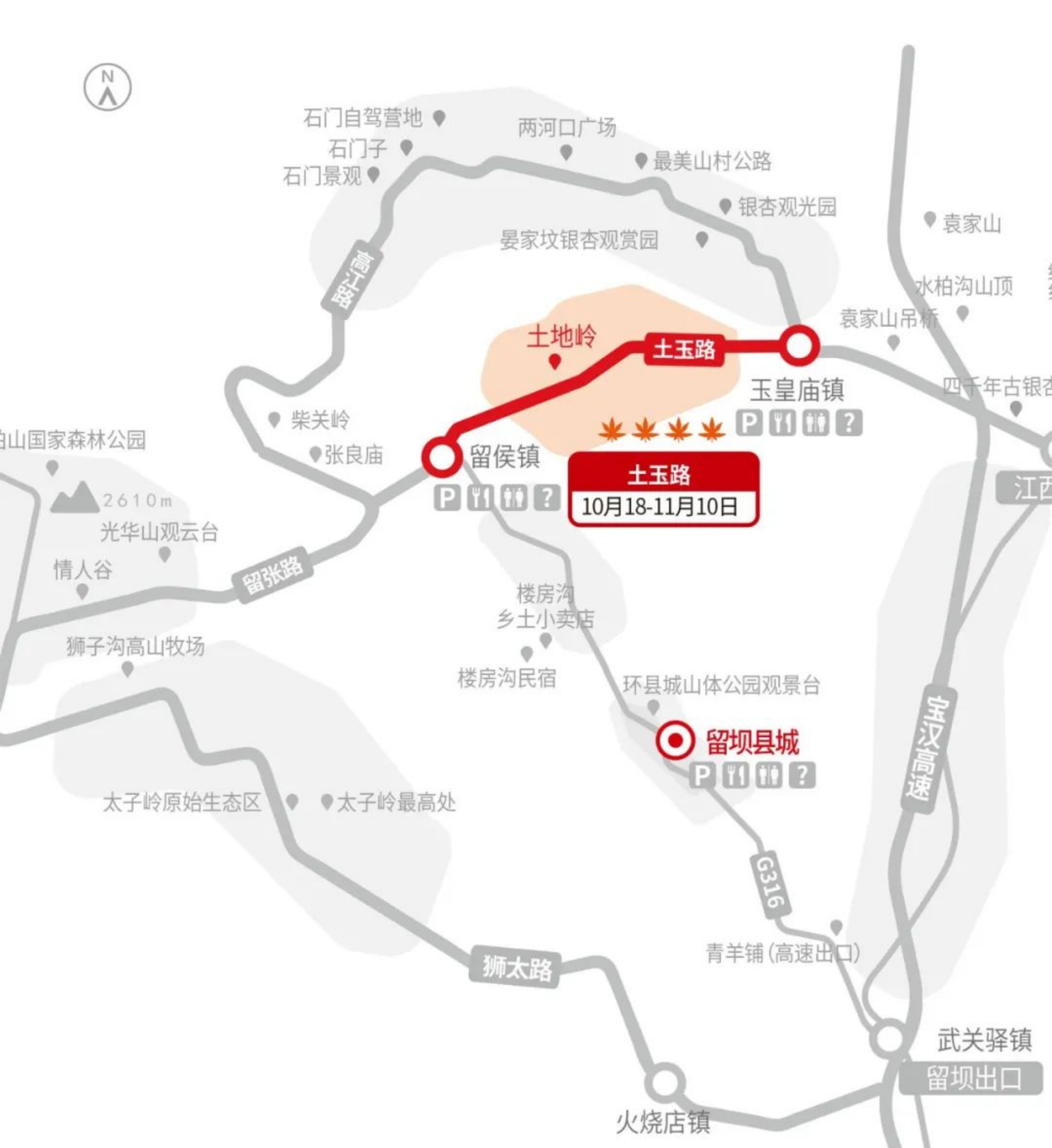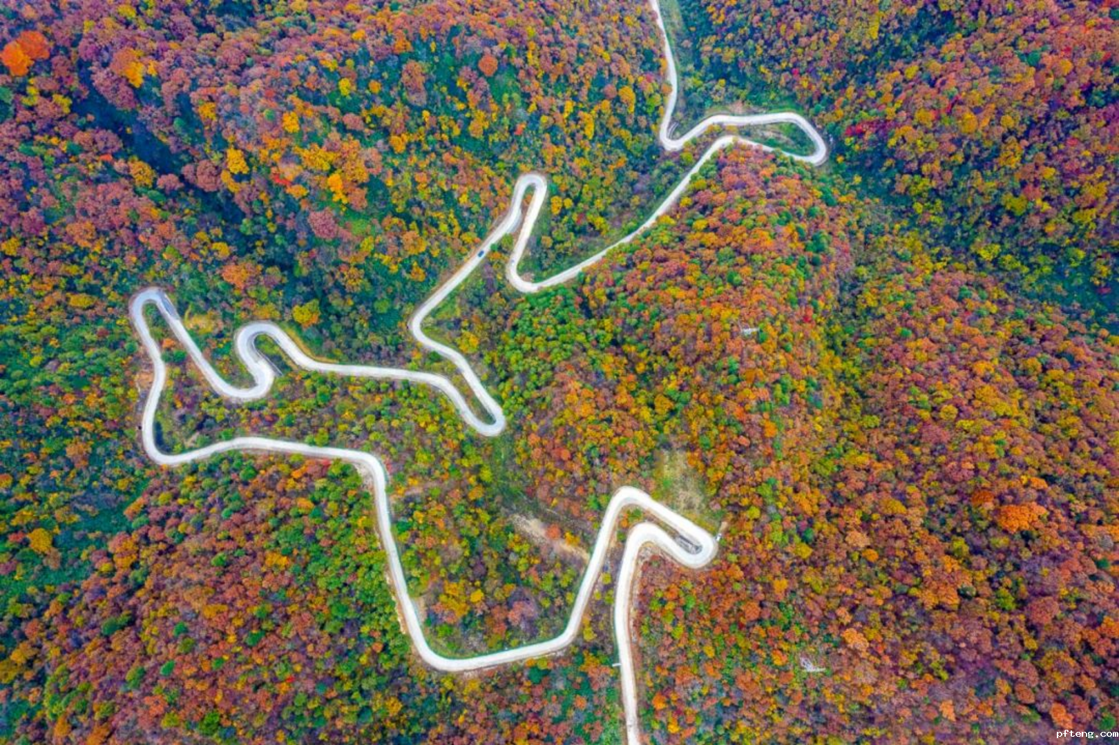 土玉路是留坝县城以北由留侯镇到玉皇庙镇的一条盘山公路,号称最挑战车技的盘山路,当地人也戏称之为“吐一路”。整条路段弯急、坡陡、路窄,虽曲折回转如长龙,而秦岭崇山之间的惊鸿绝美风光也处于其中,山高云阔,勾勒出赤中带黄的绝美彤色,人少景美,推荐车技好的朋友来此一游。