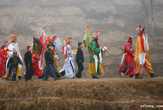 西河在崇山峻岭间盘绕, 寂寞的河水清清凌凌淌呵淌, 经岁累年冲积出一湾湾肥美平整的土地, 于是就有了生民来此居住、 生息、 耕种、 繁衍至今, 形成了独有的生活习惯, 民俗风情生态。 这里的山民敦厚持重、 勤劳朴素、 崇礼和善, 由于过去这里山大沟深、 交通不便、 相对闭塞, 以至于保留下了许多异于它处古朴淳厚的民间习俗风尚, “狮子坝地社火”就是这样一朵遗存在川道深坳里的民间艺术奇葩。 其由清末狮子坝人王得印, 年青时常去宝鸡、 关中一带行医治病, 喜好民间文艺, 拜师学成后将地社火传入西河流域。原地社火形式是群体性、 社会性较强, 艺术表演形式为舞蹈加眉户曲调为主。 传入狮子坝后因地理交通闭塞及传承方式、 制度的演变而具有了自己独有的表演形式与本土化特征,它将原整本舞台大戏独幕化、 零碎化、 民间化了, 不拘场地, 可在较宽大的乡村场院上表演, 亦可在农家的门厅屋堂中开演, 分为文戏、 武戏两类, 主要表现为哑戏舞蹈打斗,视剧情也可独白或开唱, 每个剧目的演出时间短则三、 五分钟, 长则不过半个时辰。武戏类有: 战灵官、 三战吕布、 辟山救母、 哪吒闹海等; 文戏类有: 千里护皇嫂、 平贵回窑、 三娘教子、 铡美案等; 与其它地社火不同的是表演唱, 诙谐类有表演、 乐器伴奏, 如: 王大娘钉缸、 张良卖布、 猪八戒背媳妇、 十八相送等剧目。伴奏乐器多为锣、 钗、 钹、 铰、 鼓、 二胡、 板胡、 三弦等类; 兵器有刀、 茅、 剑、 鞭、 锏、 棒、 斧、 戟; 服装为各色五彩帽、 衣、 袍、 蟒、 襟、箭衣、 彩裙、 龙凤头饰、 靴; 道具有各类面具、 令旗、 令剑、 水火棍、 枷、 排灯、文扇、 武扇等。