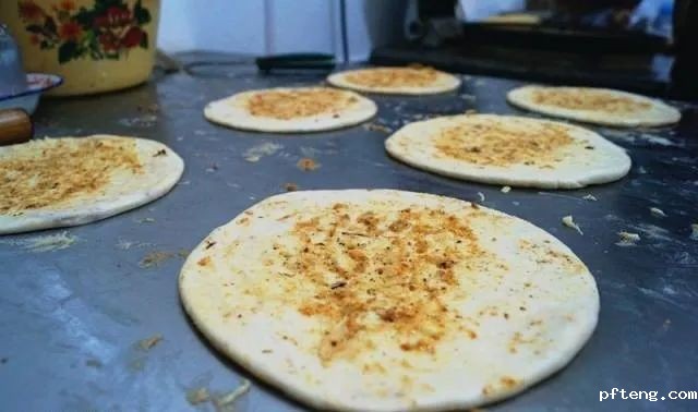 它是这样的做法,将当地盛产的核桃敲壳取仁,同芝麻(先放核桃后放芝麻)一块儿放置在柴火锅中慢慢翻炒,微火焙熟散出香味儿后,取出经过颠筛去除核桃皮儿,放在石臼窝里踏成粗颗粒状盛出装盆中调味备用。面粉也提前数小时发酵备用。在街边支一个底下烧炭火的铁“鏊子”(烙饼的生铁平底锅),面发酵好后,反复搓揉到既筋道又柔软时用手揪出适量的份额坨坨,小木擀面杖在案板上敲出“铛铛”有节奏的声响,吸引来了古道上来往已经饥肠辘辘的商旅食客。饼摊的主人一边招呼着客人,一边双手中油浸浸的小擀杖上下翻飞,瞬息之间就擀好了一张张面片,三根手指头划拉一撮小盆中和好了清油、加了盐和花椒的核桃芝麻馅儿,在面片上厚厚一抹,揉成团、擀压成饼状,然后数张面饼放进鏊子中盖上盖用微火焙烤。少顷,炭火烘焙的面饼在鏊子中散发出了香气,揭开锅盖,将面饼翻身,扣上锅盖再烙……核桃馍诱人的香气已经飘散了一整条街。炕好的面饼取出来放在案板上竹篓当中,新擀好的核桃饼又挨个放进锅中,继续进行着下一轮回的烘焙。
