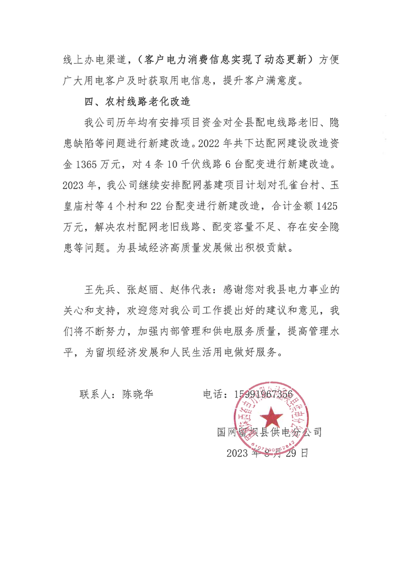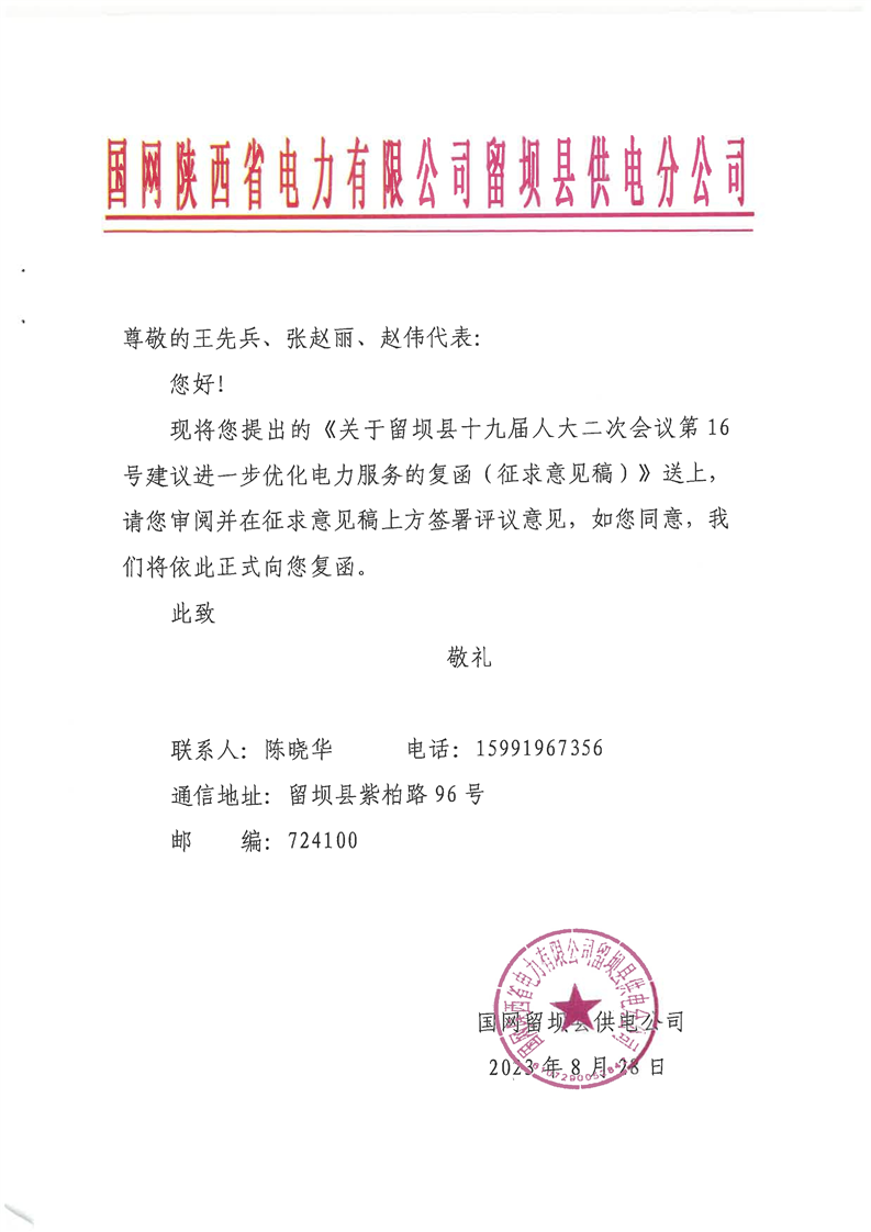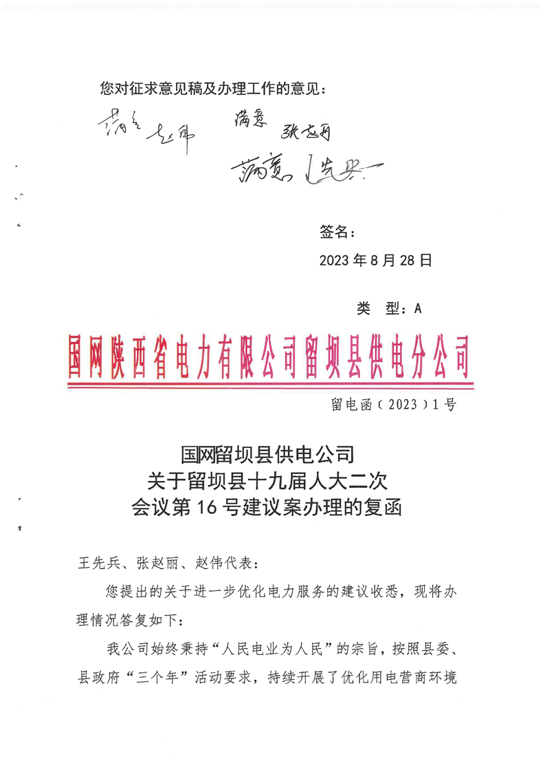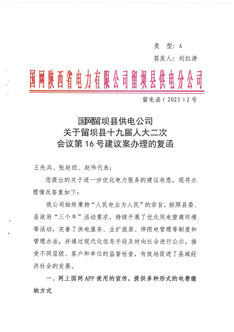 国网陕西省电力有限公司留坝县供电分公司关于留坝县十九届人大二次会议第16号建议进一步优化电力服务的复函