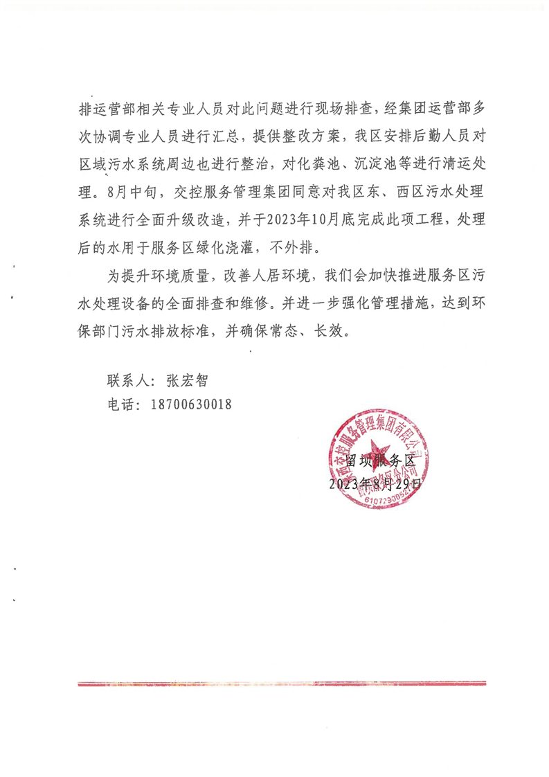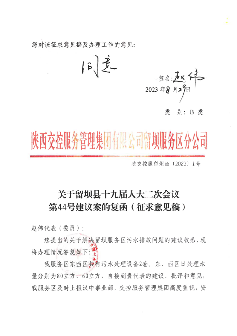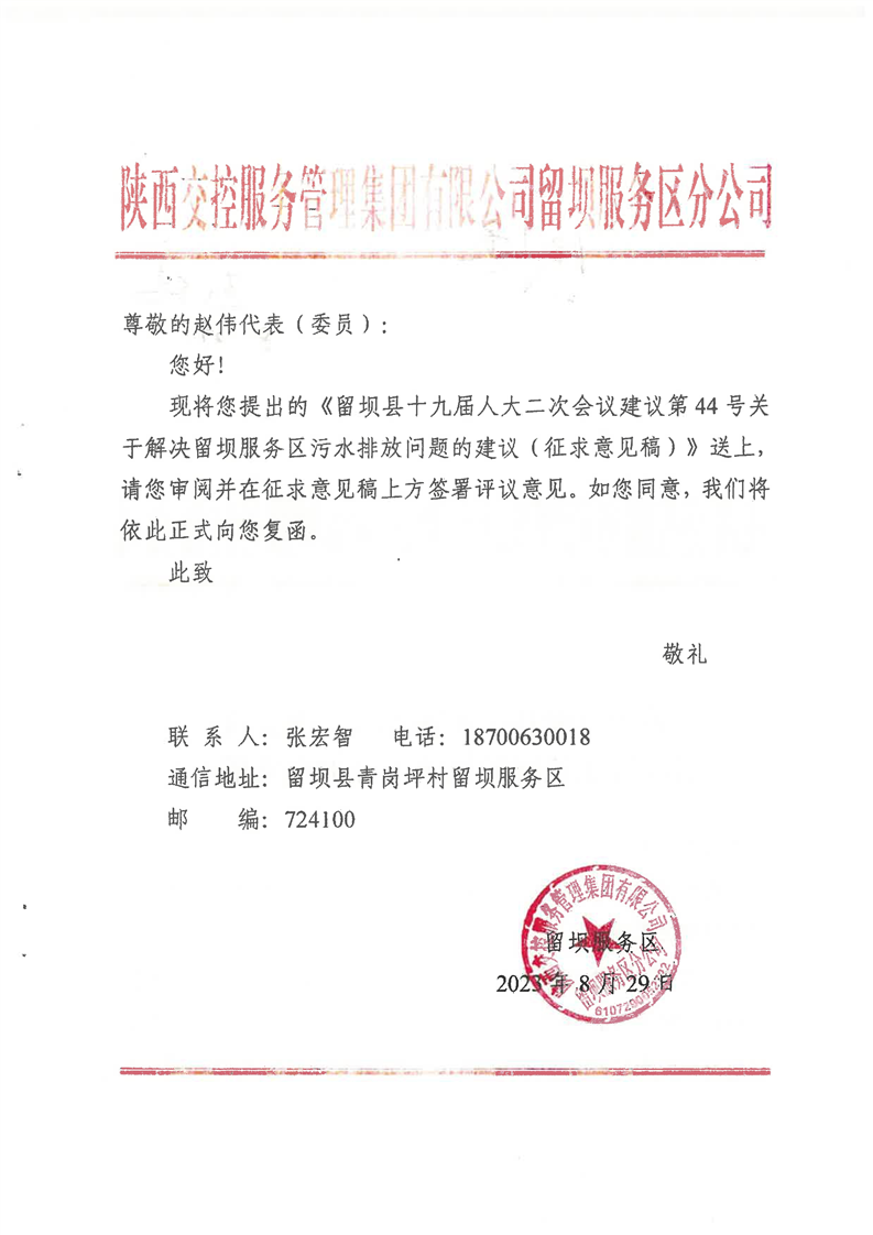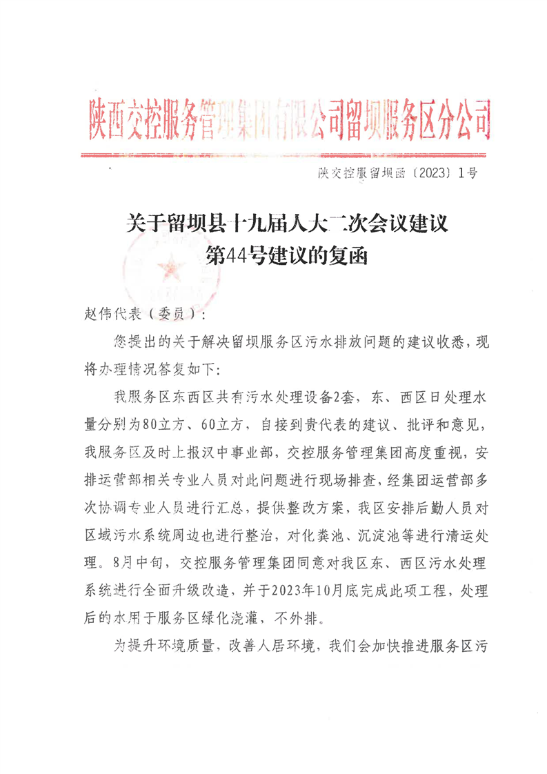 陕西交控服务管理集团有限公司留坝服务区分公司留坝县十九届人大二次会议建议第44号关于解决留坝服务区污水排放问题的建议的复函