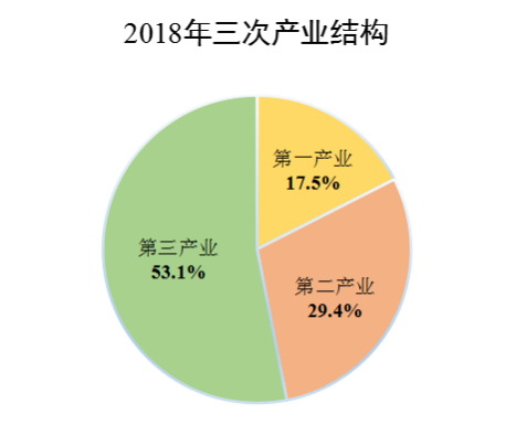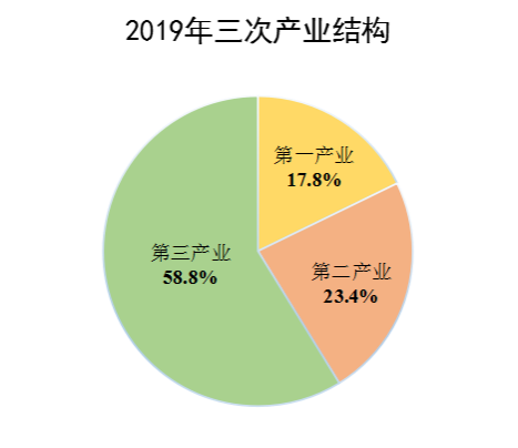 生产总值中,第一、第二和第三产业增加值占比分别为17.8%、23.4%和58.8%。与2018年相比,第一产业占比提高0.3个百分点,第二产业占比下降6个百分点,第三产业占比提高5.7个百分点。