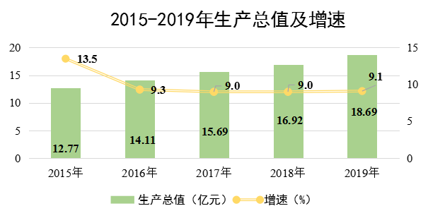 初步核算,全年实现生产总值18.69亿元,同比增长9.1%。其中,第一产业增加值3.33亿元,同比增长4.5%;第二产业增加值4.37亿元,同比增长12.7%;第三产业增加值10.99亿元,同比增长9.2%。人均生产总值43044元,同比增长10.5%。非公有制经济增加值占生产总值比重为50.03%,较上年提高1.71个百分点。战略性新兴产业增加值增长17.05%。