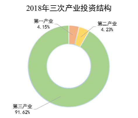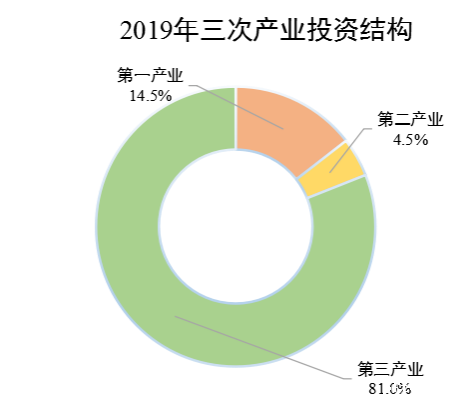 城镇固定资产投资中,第一产业完成投资比上年增长2.97倍;第二产业完成投资比上年增长21.9%;第三产业完成投资比上年增长0.7%。第一、第二和第三产业投资占比分别为14.5%、4.5%、81%。