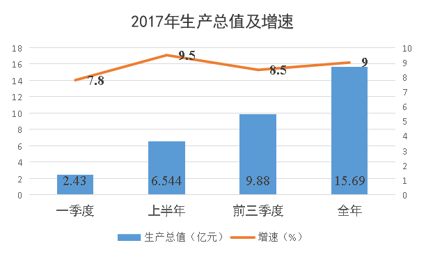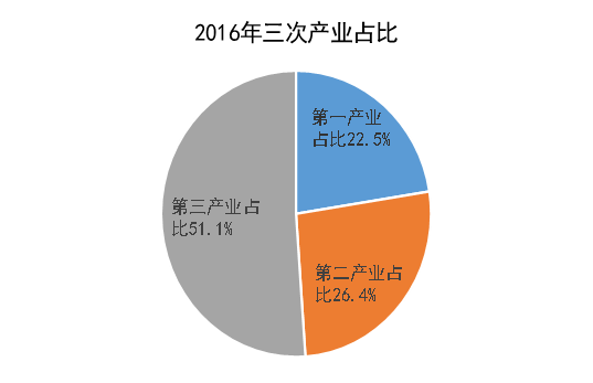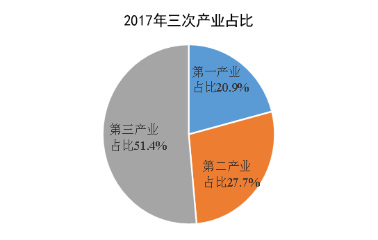 地区生产总值中,第一、第二和第三产业增加值占生产总值比重分别为20.9%、27.7%和51.4%。与2016年相比,第一产业占比下降1.6个百分点,第二产业占比提高1.3个百分点,第三产业占比提高0.3个百分点。