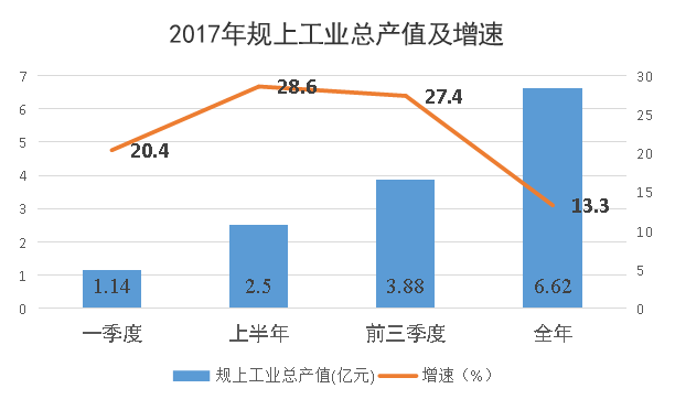 规模以上工业完成总产值6.62亿元,同比增长13.3%。工业增加值2.02亿元,同比增长14.5%,其中,规模以上工业实现增加值1.88亿元,同比增长15.1%;规模以下工业实现增加值0.14亿元,同比增长6.6%。工业增加值占生产总值的比重为12.9%。