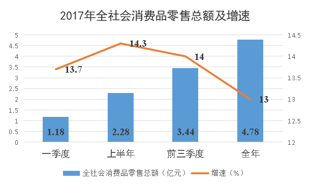 全年实现全社会消费品零售总额4.78亿元,同比增长13%。从地域看:城镇完成零售额3.48亿元,同比增长12.7%;乡村完成零售额1.3亿元,同比增长13.6%。分行业看,批发和零售业消费品零售额3.36亿元,同比增长11.13%;住宿和餐饮业零售额1.42亿元,同比增长17.5%。