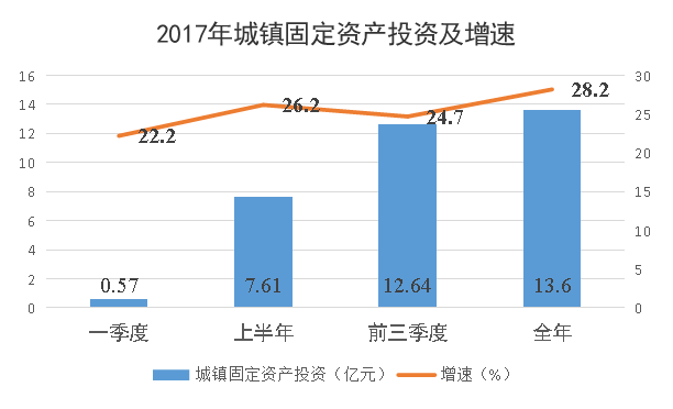 全社会固定资产投资完成32.48亿元,同比增长22.2%,其中,完成城镇固定资产投资13.6亿元,同比增长28.2%。分产业看:第一产业投资0.79亿元,占比5.8%,第二产业投资1.25亿元,占比9.2%,第三产业投资11.55亿元,占比85%。