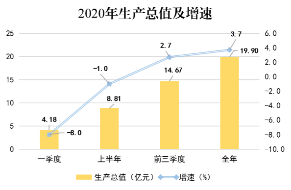 初步核算,全年实现生产总值19.90亿元,同比增长3.7%。其中,第一产业增加值3.86亿元,同比增长4.5%;第二产业增加值4.41亿元,同比增长8.6%;第三产业增加值11.63亿元,同比增长1.7%。非公有制经济增加值占生产总值比重为51.83%。