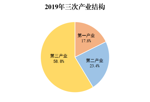 生产总值中,第一、第二和第三产业增加值占比分别为19.4%、22.2%和58.4%。与2019年相比,第一产业增加值占比提高1.6个百分点,第二产业、第三产业增加值占比分别下降1.2个、0.4个百分点。