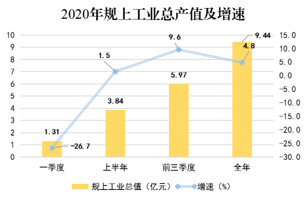 规模以上工业完成总产值9.44亿元,同比增长4.8%。其中,轻工业完成产值5.99亿元,增长20.8%;重工业完成产值3.45亿元,下降14.5%。全部工业增加值2.41亿元,同比增长5.8%,