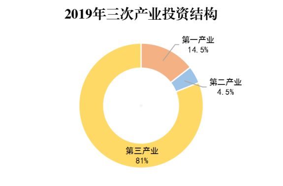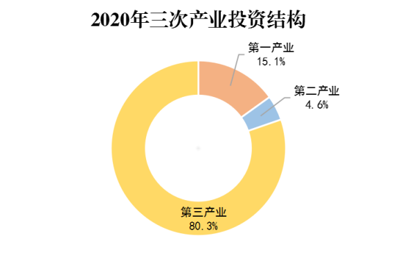 固定资产投资中,第一产业完成投资比上年增长12.1%;第二产业完成投资比上年增长8.0%;第三产业完成投资比上年增长6.1%。第一、第二和第三产业投资占比分别为15.1%、4.6%、80.3%。
