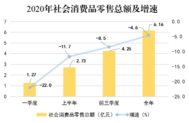 全年实现社会消费品零售总额6.16亿元,同比下降4.6%。其中,限上单位实现消费品零售额4.21亿元,同比增长9.5%,占比为68.3%。按经营单位所在地分,城镇消费品零售额4.44亿元,同比下降4.9 %;乡村消费品零售额1.73亿元,同比下降3.9%。按消费形态分,餐饮收入1.78亿元,同比下降4.0%;商品零售额4.38亿元,同比下降4.9%。