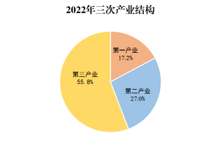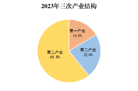 生产总值中,第一、第二和第三产业增加值占比分别为16.4%、22.8%和60.8%。与2022年相比,第一产业、第二产业增加值占比分别下降0.8个、4.2个百分点,第三产业增加值占比提高5.0个百分点。