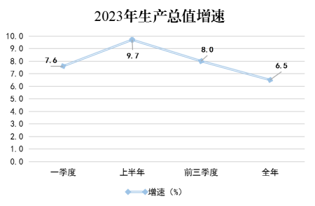 初步核算,全年实现生产总值同比增长6.5%。其中,第一产业增加值同比增长4.6%;第二产业增加值同比增长9.2%;第三产业增加值同比增长6.0%。非公有制经济增加值占生产总值比重为55.3%。