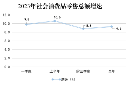 全年实现社会消费品零售总额同比增长9.3%。其中,限上单位实现消费品零售额同比增长16.9%,占比为81.1%。按经营单位所在地分,城镇消费品零售额同比增长9.1%;乡村消费品零售额同比增长9.8%。按消费形态分,餐饮收入同比增长14.0%;