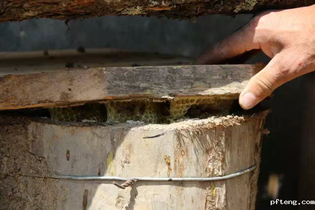 这是棒棒桶蜂箱,张大伯为了让我们更直观的了解内部的情况,特意打开了一桶让我们观察,这种棒棒桶的蜂箱一般不能随意打开,就算收蜜也只是一年收获一次,所以在质量上属于上品。原先户外的时候在山区见过这种棒棒桶,一般都是放置在高处的岩石上,棒棒桶的制作也能走外形看出来一些,它是由整段大的树干掏空而成,很古老的模式。棒棒桶每年收获一次,产量都不大,多则60-80斤,少则20来斤,产量与棒棒桶的大小,当年的天气、环境都有关系。产出的蜂蜜还不能全部拿走,需留一部分给蜜蜂作为生存食量用。