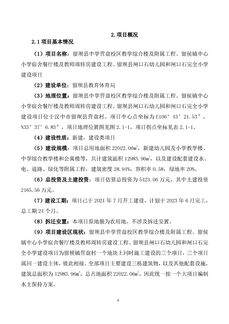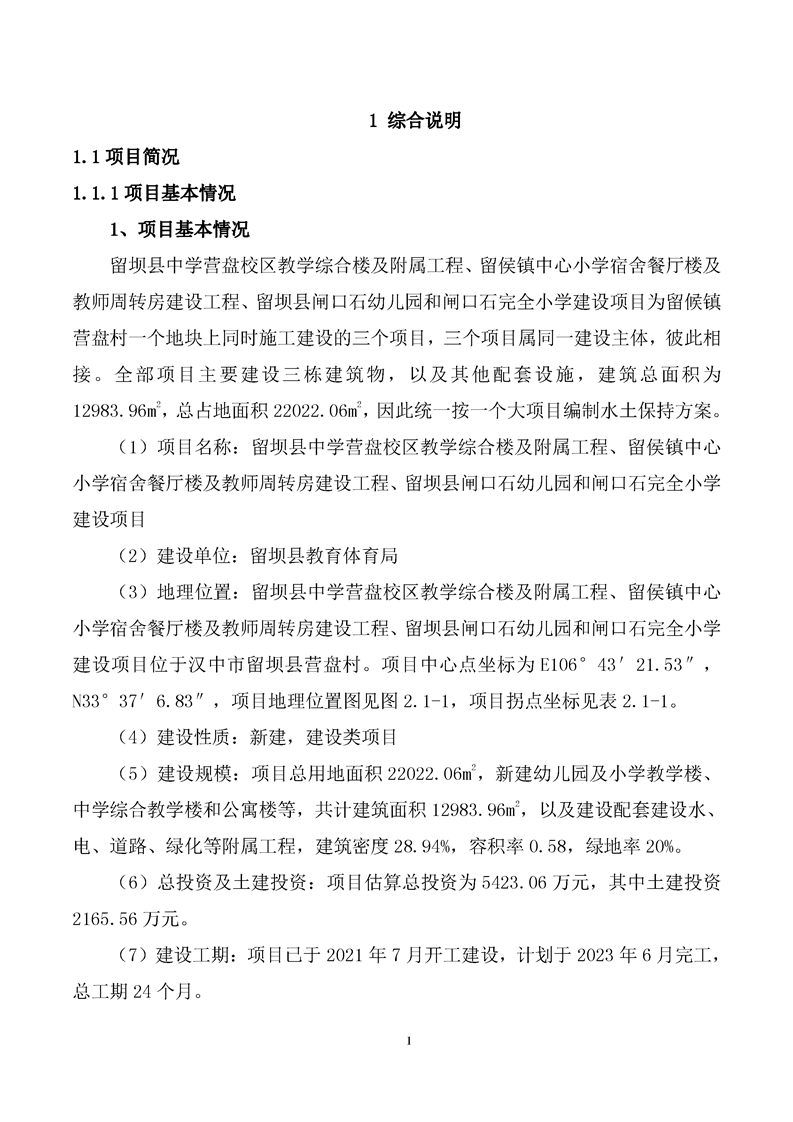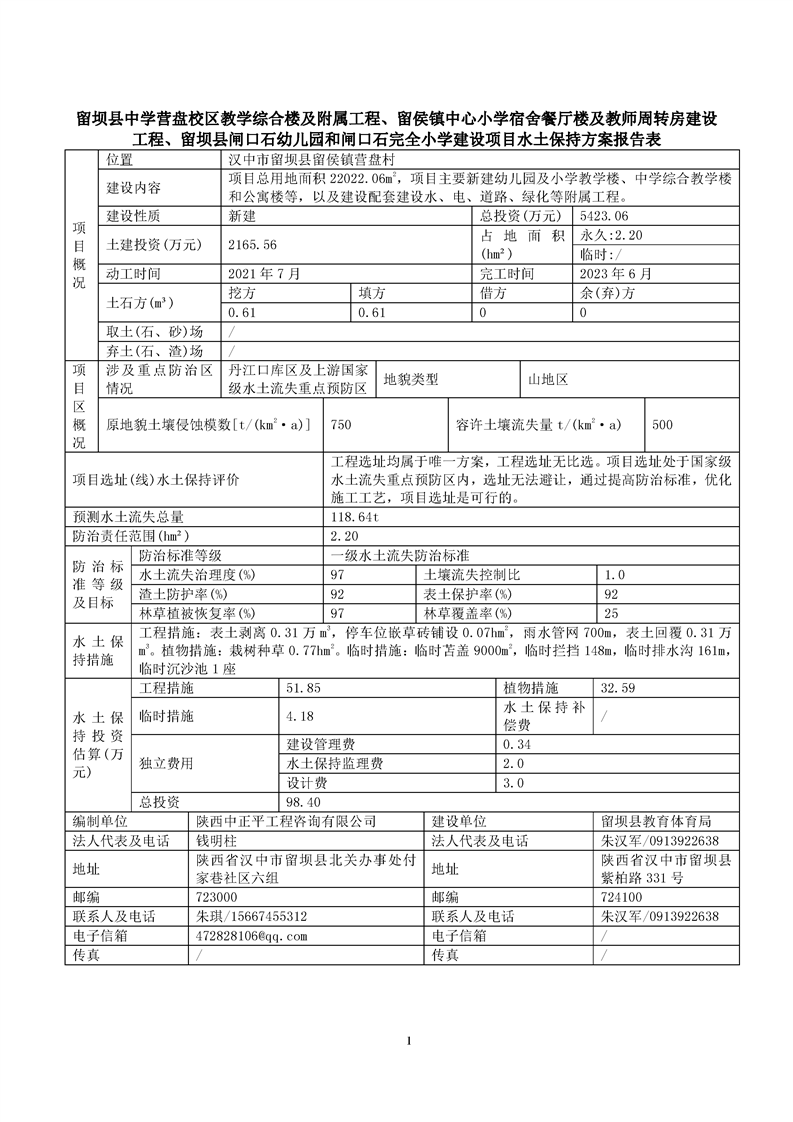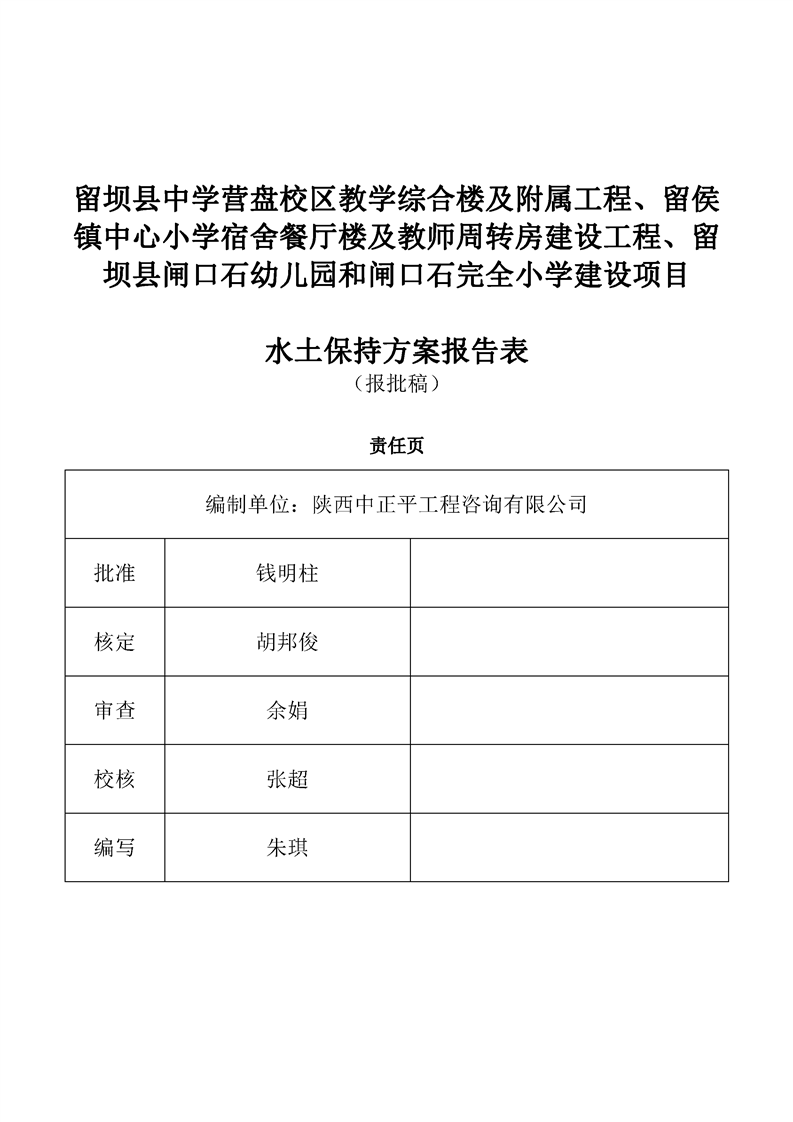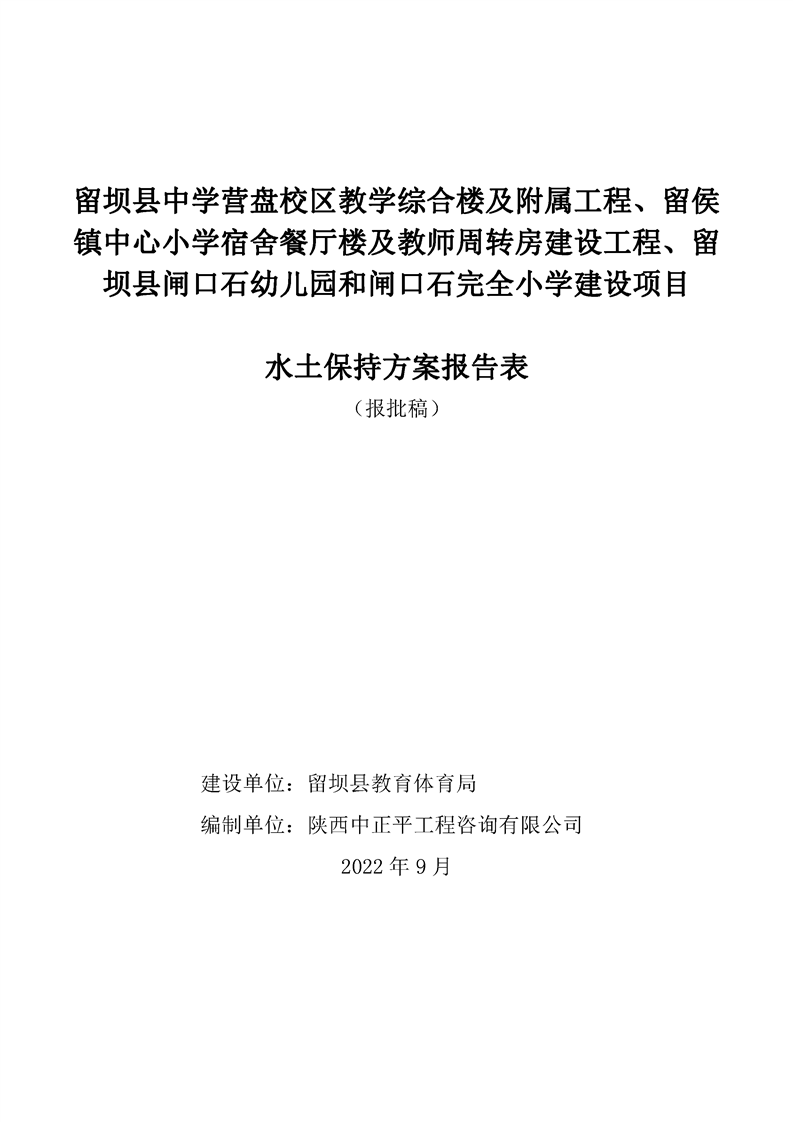 留坝县中学营盘校区教学综合楼及附属工程、留侯 镇中心小学宿舍餐厅楼及教师周转房建设项目、留 坝县闸口石幼儿园和闸口石完全小学建设项目 水土保持方案报告表