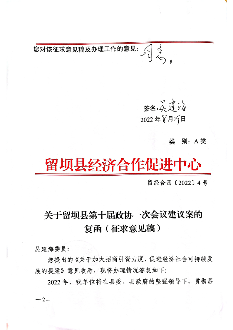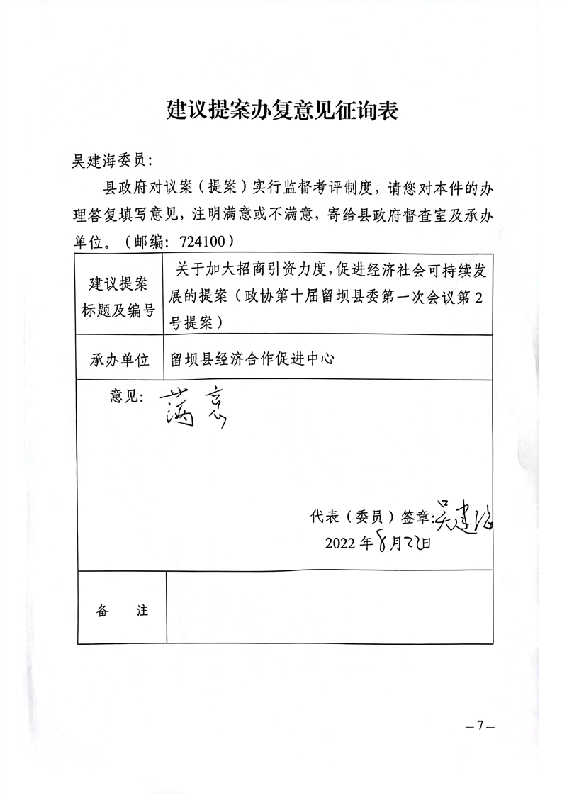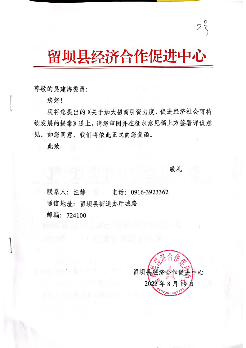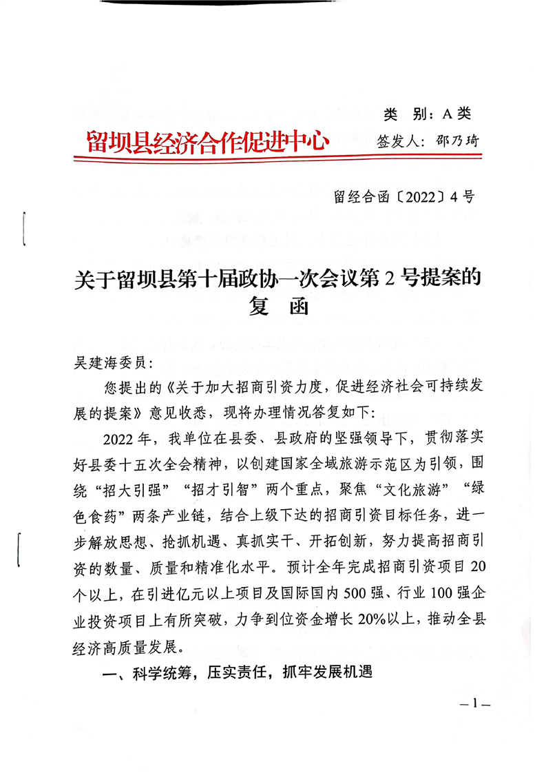 关于政协十届留坝县委员会第一次会议建议案的复函